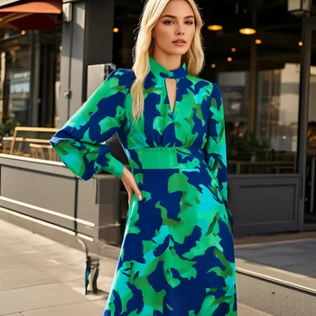 PB & ZA 2025 vestido elegante de manga larga para mujer cuello alto detalles de ojo de cerradura estampado abstracto para oficina Simple para primavera
